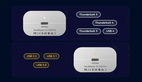 设计上,D1 SSD Pro配备创新“视觉诊断”功能:接入雷电5/4/3或USB4超高速接口时,指示灯呈白色,显示巅峰性能。
